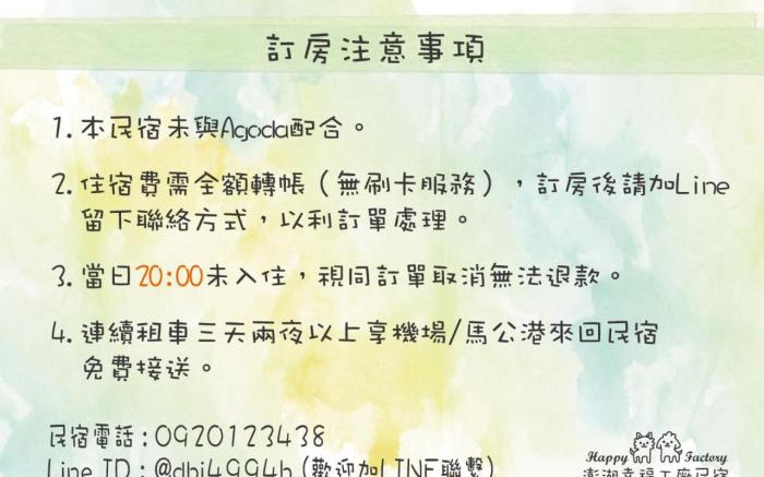 Experience an abundance of unparalleled facilities and features at Happy-Factory Homestay.Maintain seamless communication using the complimentary Wi-Fi at homestay.Car hire offerings at the homestay enhance the ease of discovering Penghu.Reception assistance is offered at the homestay featuring luggage storage. Kindly note that smoking is prohibited in the homestay to ensure fresher air for all visitors.At Happy-Factory Homestay, every guestroom is provided with convenient amenities and fittings to ensure a comfortable stay.Enhance your experience at homestay with the knowledge that certain rooms are equipped with linen service, blackout curtains and air conditioning for your convenience.A few accommodations within Happy-Factory Homestay offer unique design elements such as a balcony or terrace. Certain rooms boast in-room amusement features such as television and cable TV, offering guests an enjoyable stay. In select rooms within the homestay, a refrigerator, instant coffee and instant tea is available to cater to your requirements when desired. In the homestay, certain guest bathrooms come equipped with essential bathroom amenities, such as a hair dryer and toiletries, ensuring a comfortable stay for guests. During your stay at minsu, an array of engaging activities and amenities guarantees a delightful experience.Conclude your holiday experience perfectly by visiting hot tub before you depart.