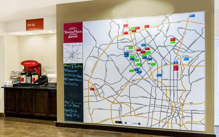 TownePlace Suites by Marriott San Antonio Northwest offers top-notch services and amenities, ensuring guests experience utmost comfort. Visitors can take advantage of the accessible parking options directly at the hotel. The accommodating team at the reception will aid you with amenities such as safety deposit boxes. Traveling with minimal baggage is achievable at TownePlace Suites by Marriott San Antonio Northwest, as the hotel's laundromat and dry cleaning service ensures your garments stay fresh. Room amenities feature daily housekeeping, allowing you to unwind and make the most of your visit.Minor items you neglected to bring won't cause major issues! Simply visit convenience stores to acquire what's necessary. The hotel maintains a completely smoke-free zone, providing a breathable atmosphere.Each accommodation at TownePlace Suites by Marriott San Antonio Northwest is thoughtfully created and adorned to provide visitors with a comfortable, home-like atmosphere.In select rooms, guests can enjoy a touch of amusement with the availability of cable TV for their entertainment.Rest assured, in a few chosen rooms, the presence of instant tea can be found.Understanding the significance of bathroom amenities in enhancing guest contentment, the hotel offers a hair dryer within certain chosen rooms. Begin your holiday on a high note. At TownePlace Suites by Marriott San Antonio Northwest, your mornings are greeted with a delightful, free breakfast. Should you be particularly discerning in your dining choices, you will surely appreciate having access to the on-site BBQ facilities provided at this location.