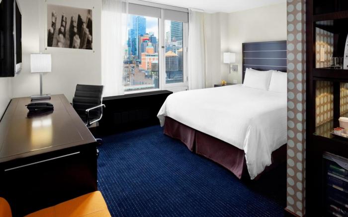 Hilton New York Fashion District offers top-notch services and amenities, ensuring guests experience utmost comfort. Share your photos and respond to emails at your convenience, thanks to the free Wi-Fi internet access offered by hotel. Visitors can take advantage of the accessible parking options directly at the hotel.Reception services such as luggage storage and safety deposit boxes are available to accommodate your requirements. Room amenities like room service and daily housekeeping contribute to making a perfect selection for your stay.The hotel maintains a completely smoke-free zone, providing a breathable atmosphere. Each accommodation at Hilton New York Fashion District is thoughtfully created and adorned to provide visitors with a comfortable, home-like atmosphere. In select rooms of the hotel, guests can enjoy the advantage of having blackout curtains available for their convenience.In select rooms, guests at the hotel can enjoy top-notch in-room entertainment with television and in-room video streaming available for their convenience.Rest assured, in a few chosen rooms, the presence of instant tea can be found. Maintain your cleanliness and comfort using a hair dryer and toiletries available in select guest restrooms. Should you prefer not to venture out for a meal, the enticing culinary choices at hotel are always available for your satisfaction.Experience an unforgettable evening with your fellow travelers just a short distance away, at hotel's bar. For those who prefer savoring meals within their personal space, Hilton New York Fashion District offers the convenience of doorstep grocery delivery, allowing you to prepare and enjoy food in your room.Indulge in the numerous pursuits available at Hilton New York Fashion District. For individuals who don't want to skip their exercise routine, visiting the hotel fitness center ensures you maintain your vitality and wellness.