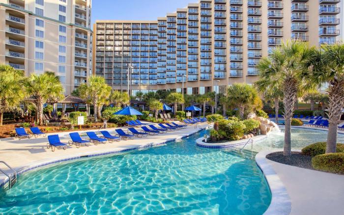 Hilton Royale Palms offers top-notch services and amenities, ensuring guests experience utmost comfort. Shuttle offerings at the hotel enhance the ease of discovering Myrtle Beach (SC). Visitors can take advantage of the accessible parking options directly at the hotel. Reception services such as concierge service and luggage storage are available to accommodate your requirements. Room amenities feature room service, allowing you to unwind and make the most of your visit.The hotel maintains a completely smoke-free zone, providing a breathable atmosphere.Each accommodation at Hilton Royale Palms is thoughtfully created and adorned to provide visitors with a comfortable, home-like atmosphere. In select rooms of the hotel, guests can enjoy the advantage of having blackout curtains available for their convenience.At Hilton Royale Palms, the uniquely tailored rooms provide a configuration choice resembling a balcony or terrace. In select rooms, guests at the hotel can enjoy top-notch in-room entertainment with television, in-room video streaming and cable TV available for their convenience.Rest assured, in a few chosen rooms, you will find the convenience of a refrigerator and instant tea at your disposal. Maintain your cleanliness and comfort using a hair dryer and toiletries available in select guest restrooms. Embark on your holiday experience in the most ideal manner. Commence each morning of your visit with an on-site breakfast.Experience the delight of a fresh morning by savoring excellent coffee at the cafe situated within hotel.Should you prefer not to venture out for a meal, the enticing culinary choices at hotel are always available for your satisfaction. Experience an unforgettable evening with your fellow travelers just a short distance away, at hotel's bar. Indulge in the numerous pursuits available at Hilton Royale Palms.Make certain to allocate time for discovering the shoreline, easily reachable right from the hotel.Unwind after a long day by stopping by hot tub and spa to rejuvenate your senses.Each day at hotel, immerse yourself in the invigorating waters of the pool, perfect for a rejuvenating plunge or a series of revitalizing laps.For individuals who don't want to skip their exercise routine, visiting the hotel fitness center ensures you maintain your vitality and wellness.