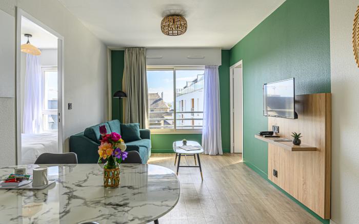 Great care is taken to ensure guests experience comfort through top-notch services and amenities. Stay connected with your associates, as complimentary Wi-Fi is available during your entire visit. When arriving by car, take advantage of the serviced apartment's convenient on-site parking facilities. To ensure the well-being and convenience of all visitors, smoking is strictly prohibited throughout the entire serviced apartment. In order to ensure the utmost level of relaxation, the guestrooms feature an inviting design and are equipped with all basic necessities, creating a delightful stay experience.To ensure your satisfaction, certain rooms in the serviced apartment come fitted with linen service for a more pleasant stay. Several chosen accommodations at Appart Hotel Le Liberte Vannes Centre ville have a balcony or terrace incorporated into the room design. In select rooms, visitors can enjoy a touch of amusement with the availability of television and cable TV for their entertainment needs.Within specific rooms, a refrigerator and a coffee or tea maker is conveniently available for your use.Understanding the significance of bathroom facilities in enhancing visitor contentment, serviced apartment offers a hair dryer and toiletries within a few chosen chambers. Start your day stress-free at Appart Hotel Le Liberte Vannes Centre ville as breakfast is made available for you on the premises. How about kicking off each day of your getaway with a delicious cup of coffee? At the serviced apartment, relish in the invigorating taste of a freshly brewed, excellent coffee.Various excellent meal offerings at serviced apartment ensure that enticing and easily accessible options are constantly available.Upon your arrival, don't miss experiencing bar for enjoyable in-house evening entertainment.Throughout the day, engage in the entertaining activities available at Appart Hotel Le Liberte Vannes Centre ville.Unwind effortlessly each day by exploring the sauna, conveniently situated within the serviced apartment.Guests who enjoy maintaining their fitness regimen while on holiday can visit the fitness center provided by serviced apartment.
