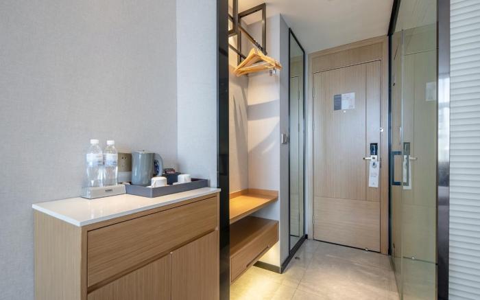 Great care is taken to ensure guests experience comfort through top-notch services and amenities. Stay connected with your associates, as complimentary Wi-Fi is available during your entire visit.The hotel offers taxi amenities to assist you in discovering your desired offerings in Yulin. When arriving by car, take advantage of the hotel's convenient on-site parking facilities. The hotel offers reception amenities including concierge service, express check-in or check-out and luggage storage to ensure a comfortable stay for guests. Whether you're here for an extended stay or simply require fresh garments, the hotel ensures your cherished travel attire remains spotless and accessible with the convenience of laundry service located on the premises. The hotel's daily housekeeping ensures an excellent option for your stay. In order to ensure the utmost level of relaxation, the guestrooms feature an inviting design and are equipped with all basic necessities, creating a delightful stay experience.To ensure a pleasant stay, a selection of rooms at hotel come furnished with linen service and air conditioning, all designed with your ease in mind.Selected rooms offer in-room amusement like television as a source of entertainment for guests to enjoy. Rest assured, quenching your thirst is not a concern with bottled water available in select accommodations.Understanding the significance of bathroom facilities in enhancing visitor contentment, hotel offers a hair dryer and toiletries within a few chosen chambers. Start your day stress-free at Borrman Hotel Yulin 1st People's Hospital Qingwan River as breakfast is made available for you on the premises.Various excellent meal offerings at hotel ensure that enticing and easily accessible options are constantly available.Visitors wishing to create their personal culinary delights will appreciate the on-site BBQ facilities provided at this establishment.Throughout the day, engage in the entertaining activities available at Borrman Hotel Yulin 1st People's Hospital Qingwan River.Unwind effortlessly each day by exploring the sauna, conveniently situated within the hotel.Guests who enjoy maintaining their fitness regimen while on holiday can visit the fitness center provided by hotel.
