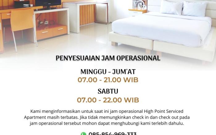 High Point Surabaya provides flawless service and all the necessary facilities for visitors. When arriving by car, you'll be grateful for the on-site complimentary parking at serviced apartment.The serviced apartment's daily housekeeping ensures an excellent option for your stay.To ensure the well-being and convenience of all visitors, smoking is strictly prohibited throughout the entire serviced apartment.In order to ensure the utmost level of relaxation, the guestrooms feature an inviting design and are equipped with all basic necessities, creating a delightful stay experience. To ensure your satisfaction, certain rooms in the serviced apartment come fitted with air conditioning for a more pleasant stay.Selected rooms offer in-room amusement like television as a source of entertainment for guests to enjoy.Within specific rooms, a refrigerator, a coffee or tea maker and bottled water is conveniently available for your use. You'll be pleased to know that select guest bathrooms offer bathroom amenities such as toiletries, ensuring a comfortable stay. Throughout the day, engage in the entertaining activities available at High Point Surabaya. Unwind by the pool at serviced apartment and cherish a leisurely moment.Guests who enjoy maintaining their fitness regimen while on holiday can visit the fitness center provided by serviced apartment.