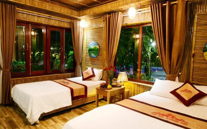 Tam Coc Amandavillas offers top-notch services and amenities, ensuring guests experience utmost comfort. Share your photos and respond to emails at your convenience, thanks to the free Wi-Fi internet access offered by hotel. Should you require transportation to or from the airport, hotel is able to organize it prior to your arrival date. Taxi, car hire and shuttle offerings at the hotel simplify arranging your excursions, explorations, and additional activities in Ninh Bình. Visitors can take advantage of the accessible parking options directly at the hotel. The accommodating team at the reception will aid you with amenities such as luggage storage. Should you desire access to the top entertainment in the city, assistance can be provided by the hotel's tours.Traveling with minimal baggage is achievable at Tam Coc Amandavillas, as the hotel's dry cleaning service and laundry service ensures your garments stay fresh. Room amenities like 24-hour room service and daily housekeeping contribute to making a perfect selection for your stay. Each accommodation at Tam Coc Amandavillas is thoughtfully created and adorned to provide visitors with a comfortable, home-like atmosphere.In select rooms of the hotel, guests can enjoy the advantage of having blackout curtains available for their convenience.Rest assured, in a few chosen rooms, the presence of a refrigerator can be found. Tam Coc Amandavillas offers a hair dryer and toiletries in the restrooms of specific accommodations. Begin your holiday on a high note. At Tam Coc Amandavillas, your mornings are greeted with a delightful, free breakfast. Should you prefer not to venture out for a meal, the enticing culinary choices at hotel are always available for your satisfaction.